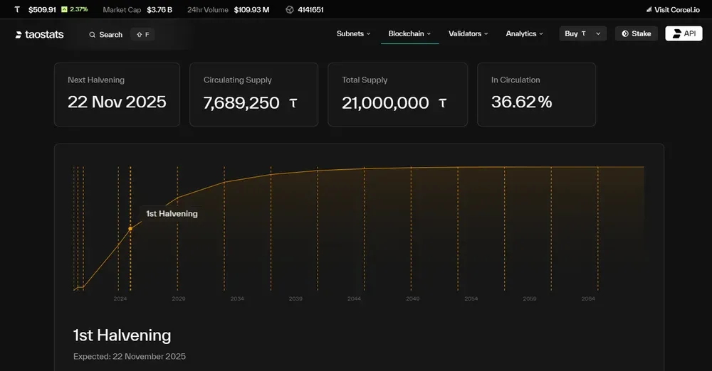| First Halving Event | December 2025 | Emission rate halves from 7,200 to 3,600 TAO/day. Mechanism stays the same. |