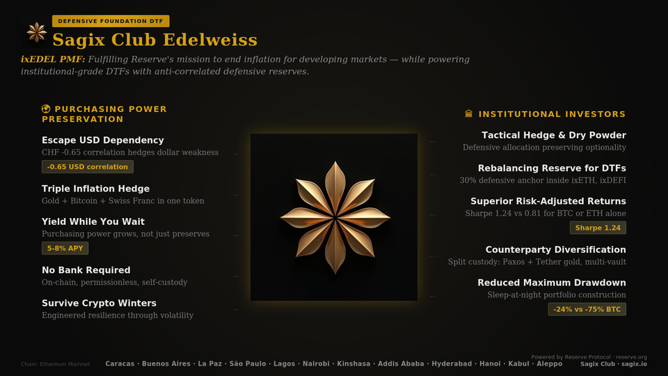 Club Edelweiss aligns with Reserve Protocol's mission to end inflation for developing markets while powering institutional-grade DTFs with anti-correlated defensive reserves.