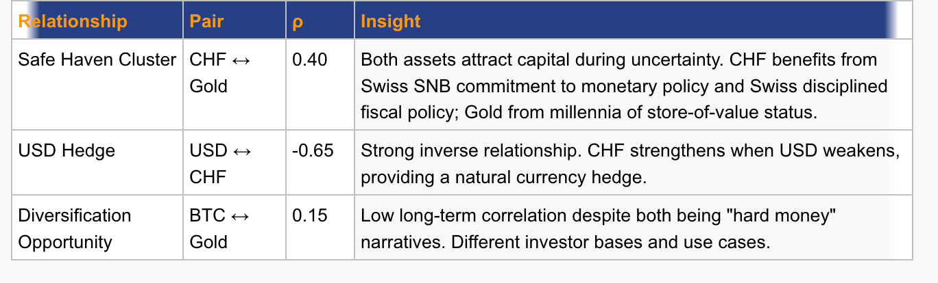 A correlation matrix reveals how assets move in relation to each other — the foundation of true diversification. When two assets have high correlation (close to 1.0), they rise and fall together, offering no protection when one crashes. When correlation is low or negative, one asset's decline is cushioned by another's stability or gain. The ixEDEL basket is constructed around this principle: Bitcoin and gold share a low 0.15 correlation despite both being "hard money" narratives; the Swiss franc moves inversely to the US dollar (-0.65); and yield-bearing stablecoins remain steady while volatile assets swing. This isn't accidental diversification — it's engineered resilience. The matrix below quantifies these relationships, showing why a 40% drawdown in Bitcoin doesn't translate to a 40% drawdown in the basket, and why rebalancing between uncorrelated assets generates alpha over time.