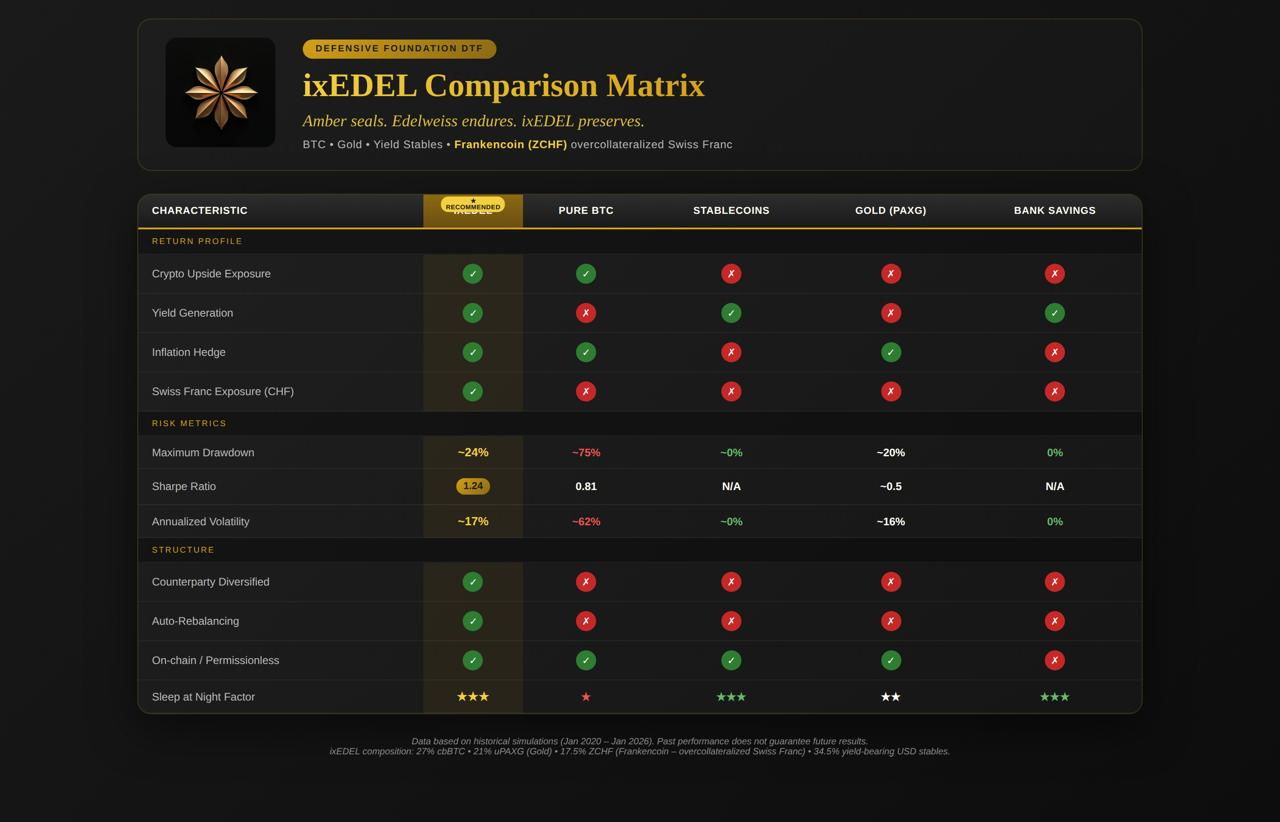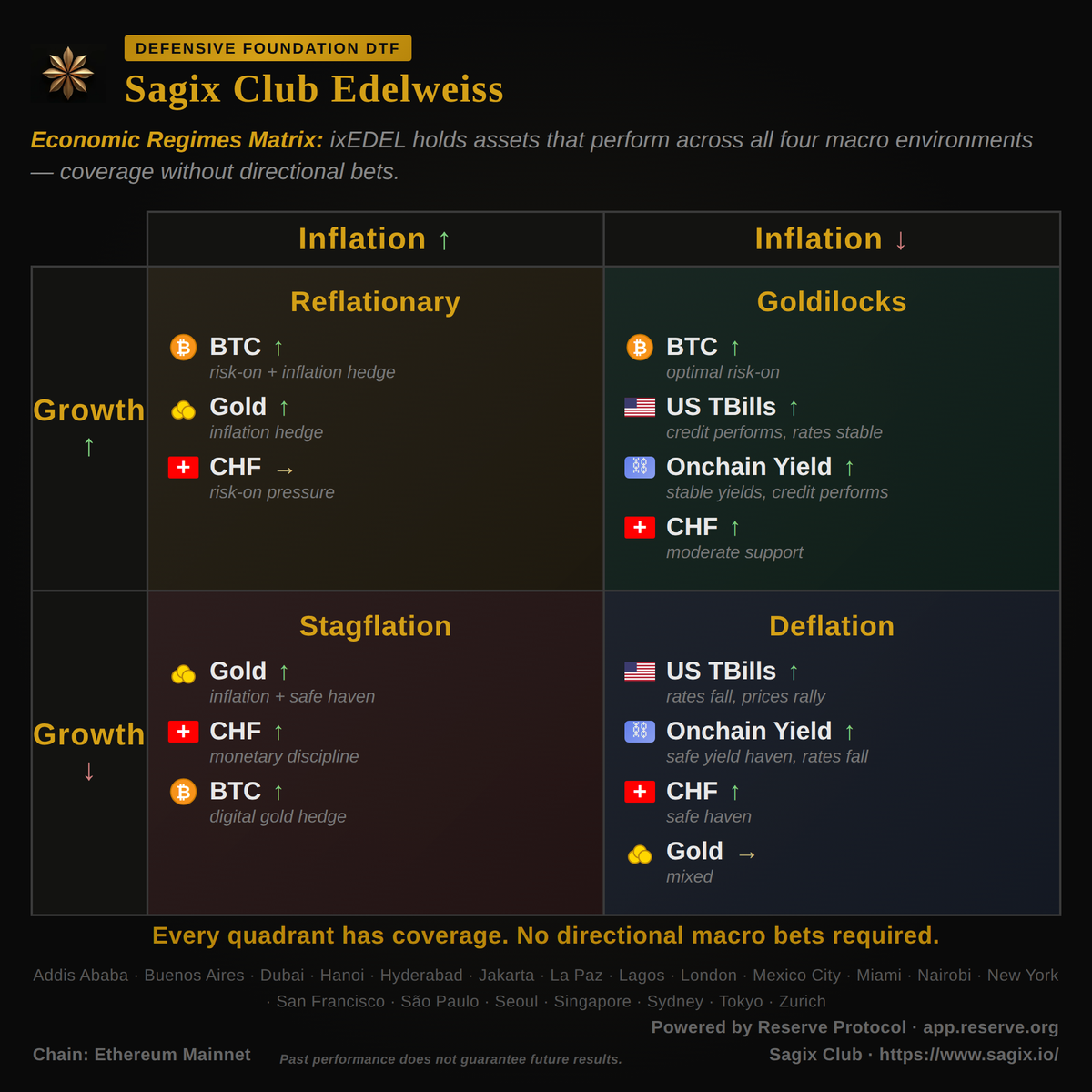 - Resilient Portfolio Strategy: Club Edelweiss (ixEDEL) uses risk parity to balance 40% yield-stablecoins, 20% tokenized gold, 20% Swiss Franc, and 20% Bitcoin for stability in any economic regime—inflation, deflation, growth, or stagnation.