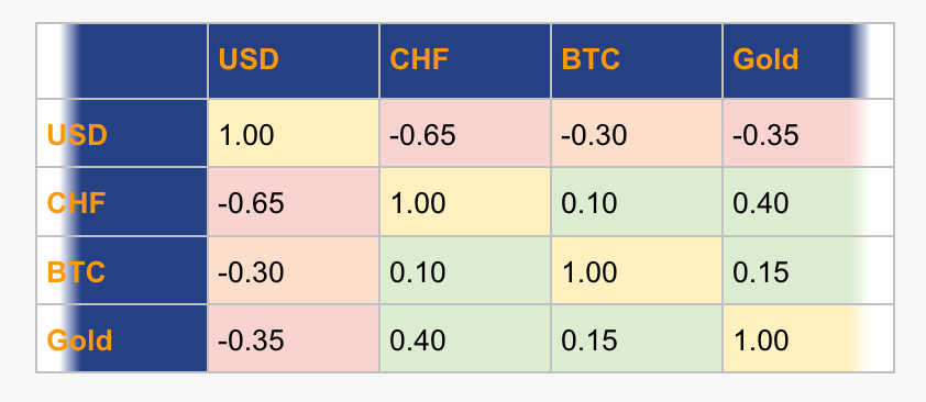 Volatilities (annualized): USD 6%, CHF 9%, BTC 62%, Gold 16%, ETH 85%