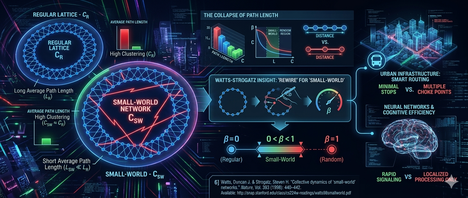 In 1998, Watts and Strogatz published their landmark paper demonstrating that networks with high local clustering and short average path lengths, what they called small-world networks, emerge when a few long-range connections are introduced into a regular lattice [6]. The defining property is that path length drops dramatically with only a small number of shortcut connections, while clustering remains high [9]. Real-world systems from power grids to neural networks to social graphs exhibit this topology, and its efficiency properties are well understood: high clustering supports specialized local processing, while short paths enable rapid global communication [10].