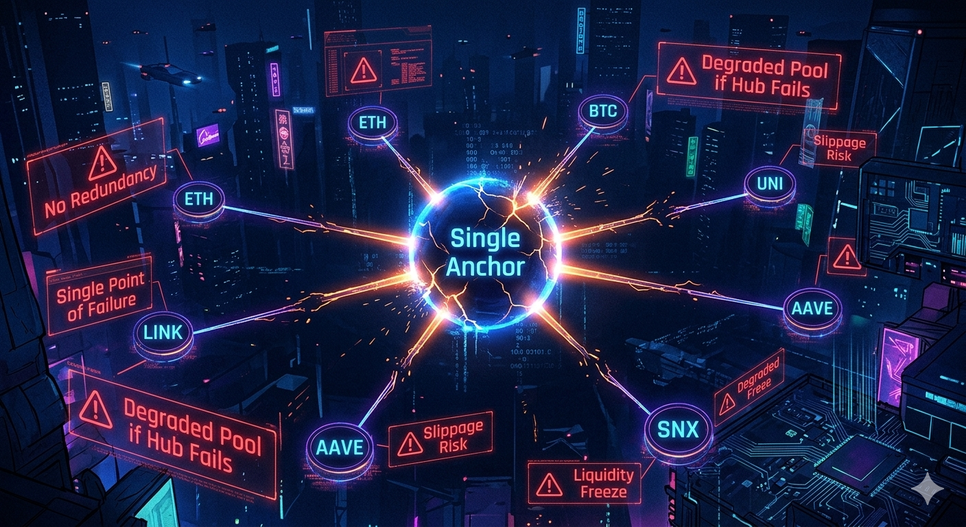 This works. But it leaves volume on the table. When only one anchor exists in a pool, every intra-pool swap between two volatile assets routes through the same path. There is no alternative route to compare against, no second pricing surface to arbitrage, and no redundancy if the anchor's liquidity thins during stress. The routing graph is a star: all roads lead to one center. If the center degrades, the entire pool degrades.