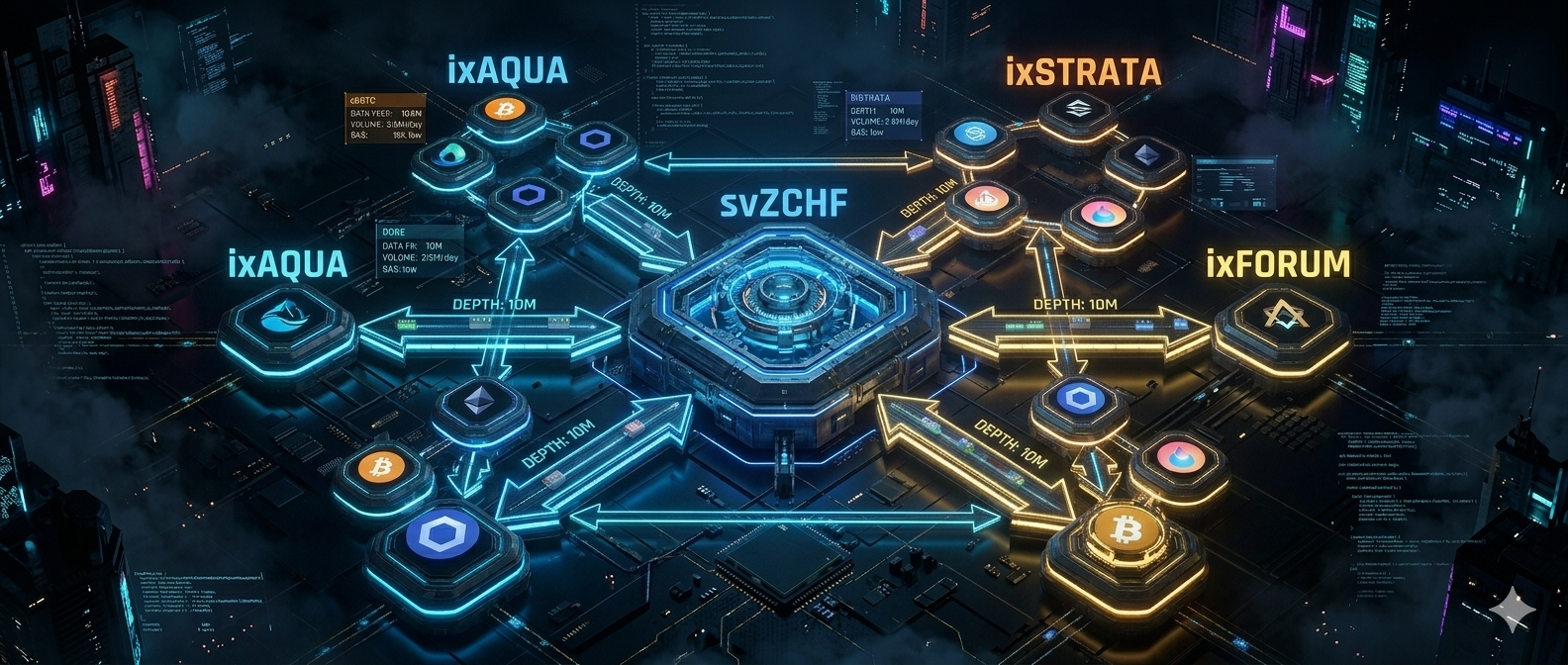 Every pool in the system contains both anchors: svZCHF at approximately 26% weight and ixEDEL at approximately 16% weight, alongside volatile bridge tokens like cbBTC, LINK, AAVE, LDO, XAUT, or sUSDS [7]. Each pool generates ten internal trading pairs. Combined across the three multi-asset pools (ixAQUA, ixSTRATA, ixFORUM) and the base svZCHF/ZCHF pool, the system creates over thirty pairs and cross-pool routes, all touching both anchors.