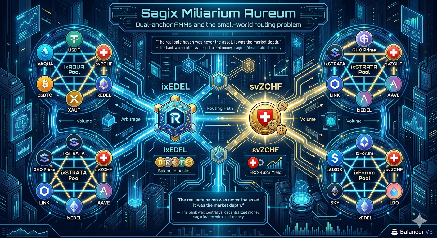 The Miliarium Aureum pool graph is a small-world network by construction. Each pool is a tightly clustered local market where five tokens trade against each other through ten internal pairs. svZCHF and ixEDEL, present in every pool, act as the shortcut connections that create short global paths between any two assets in the system [7]. A swap from cbBTC (in ixAQUA) to LDO (in ixFORUM) does not need to traverse the entire graph. It routes through svZCHF or ixEDEL in two hops because both hubs appear in both pools.