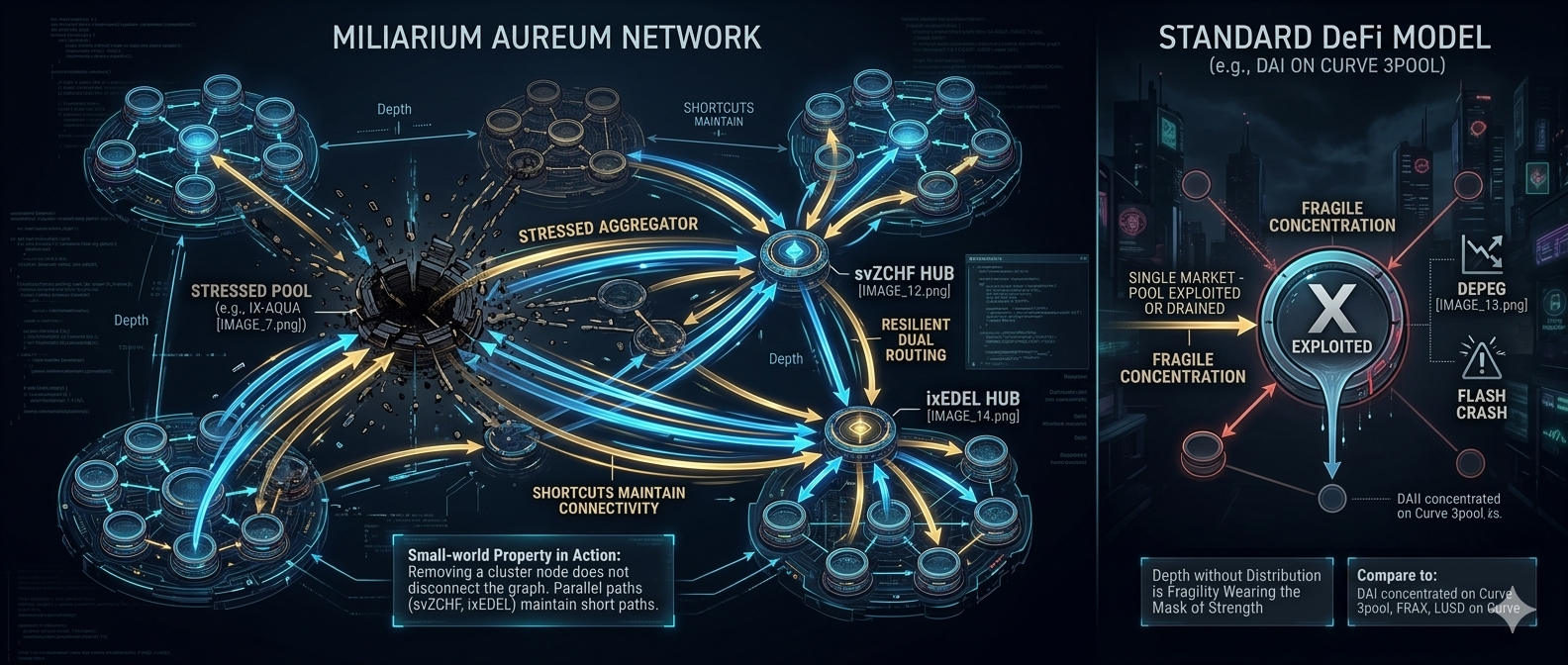 The resilience properties extend to the network topology. If one pool in the Miliarium Aureum is stressed, whether from a bridge token depeg, a flash crash in a volatile component, or a temporary liquidity drain, aggregators instantly reroute through the parallel paths that exist in every other pool sharing the same two hubs. This is the small-world property at work: removing a single cluster node does not disconnect the graph because the shortcut connections (svZCHF and ixEDEL) maintain short paths between all remaining clusters [6]. Compare this to the standard DeFi liquidity model, where a stablecoin's deepest pool sits on a single venue. If that venue is exploited or drained, the stablecoin loses its primary market in one event. DAI concentrated on Curve's 3pool. FRAX concentrated on Curve. LUSD relied heavily on one Curve pair. Depth without distribution is fragility wearing the mask of strength.
